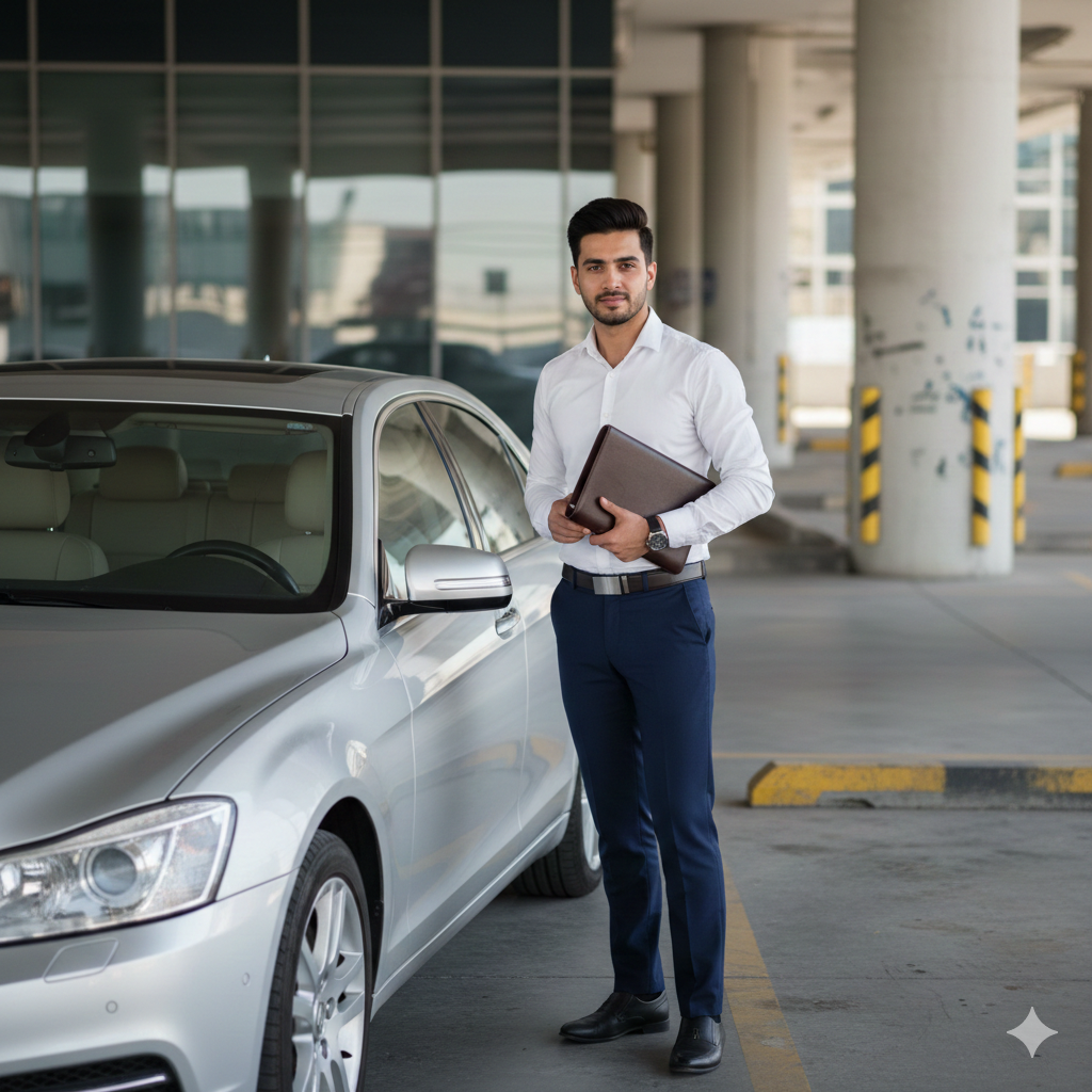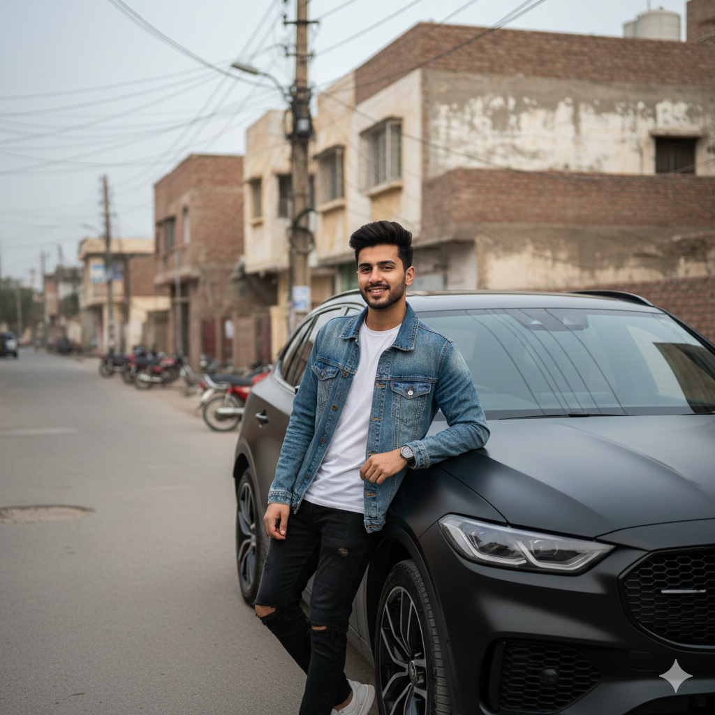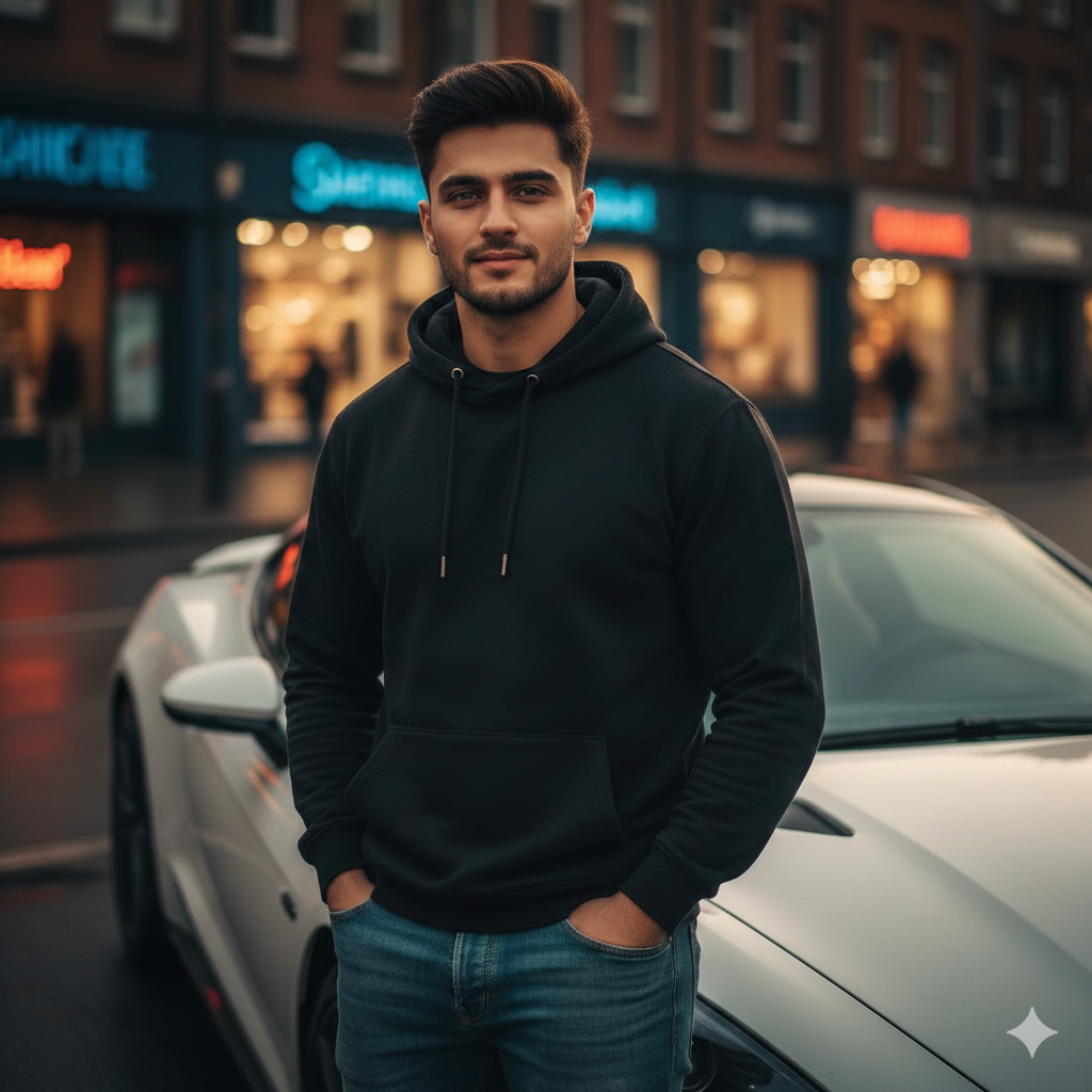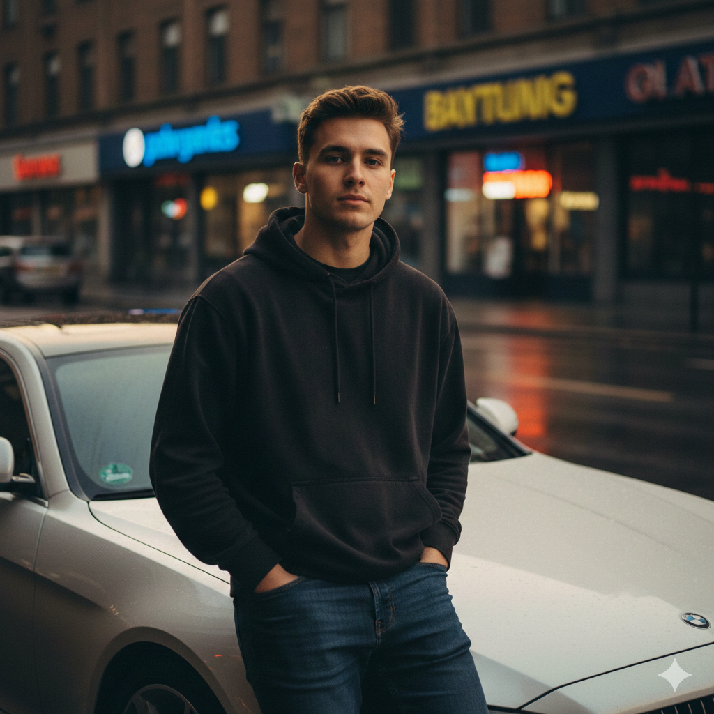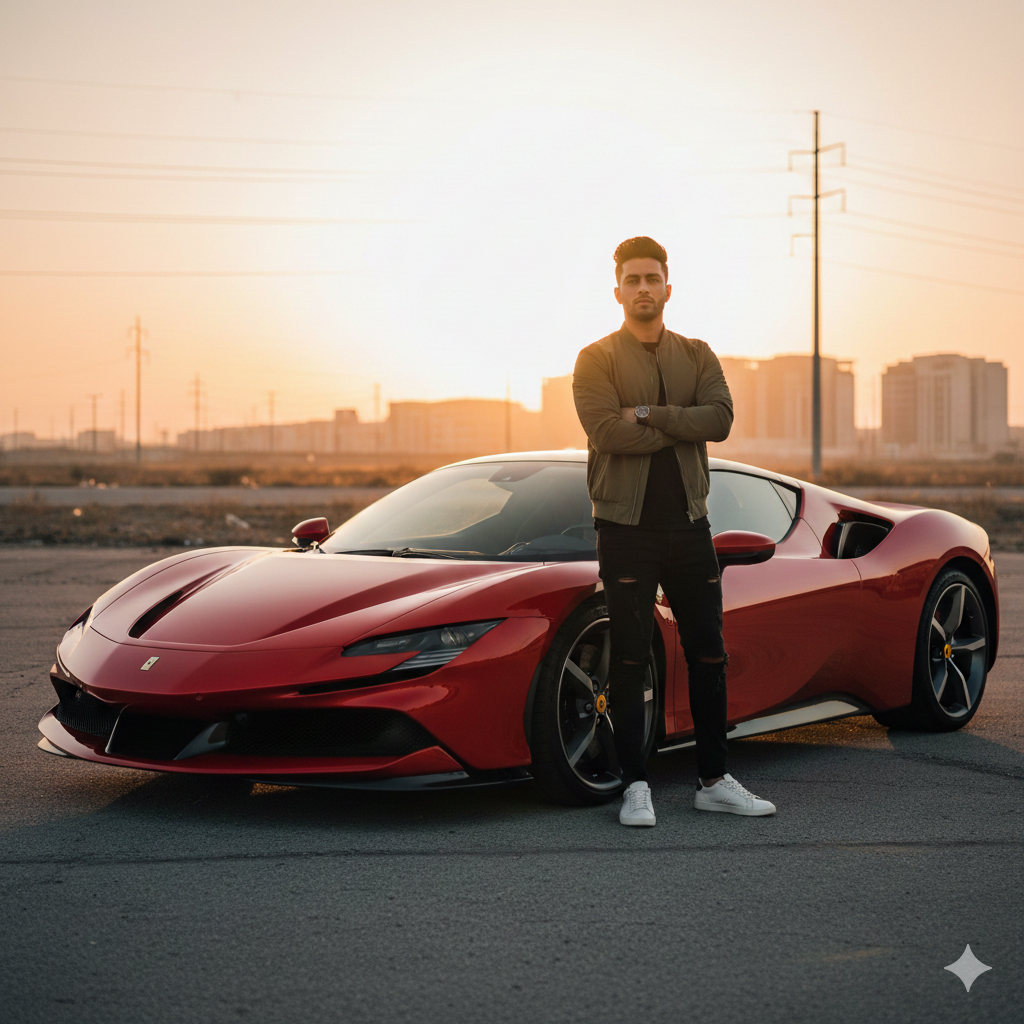 Prompt: Generate a photorealistic image of a young man leaning against a luxury black sedan in an underground parking garage with fluorescent lighting overhead. Medium shot, 50mm lens, eye-level angle, 4K resolution. He stands with arms crossed, one ankle crossed over the other, looking directly at camera with a confident, slightly arrogant expression. Wearing a slim-fit black suit with no tie, white shirt unbuttoned at collar, expensive watch visible. Natural skin texture with visible pores and fine details. Background shows concrete pillars, parked vehicles in shadows, and industrial ceiling with pipes. Use the uploaded reference image(s) with 100% accuracy. Don’t change face(s).